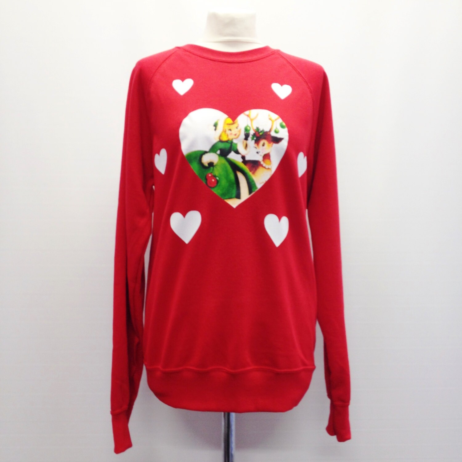 Handmade Red White Kitsch Reindeer Hearts Christmas Xmas Jumper Sweater