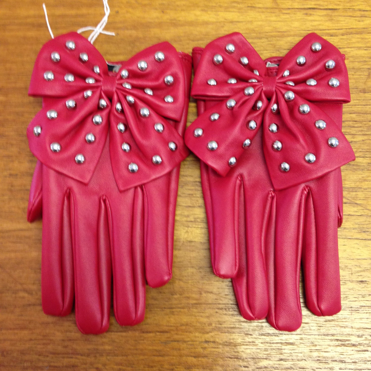 Red Bow Stud Biker Leather Look Gloves