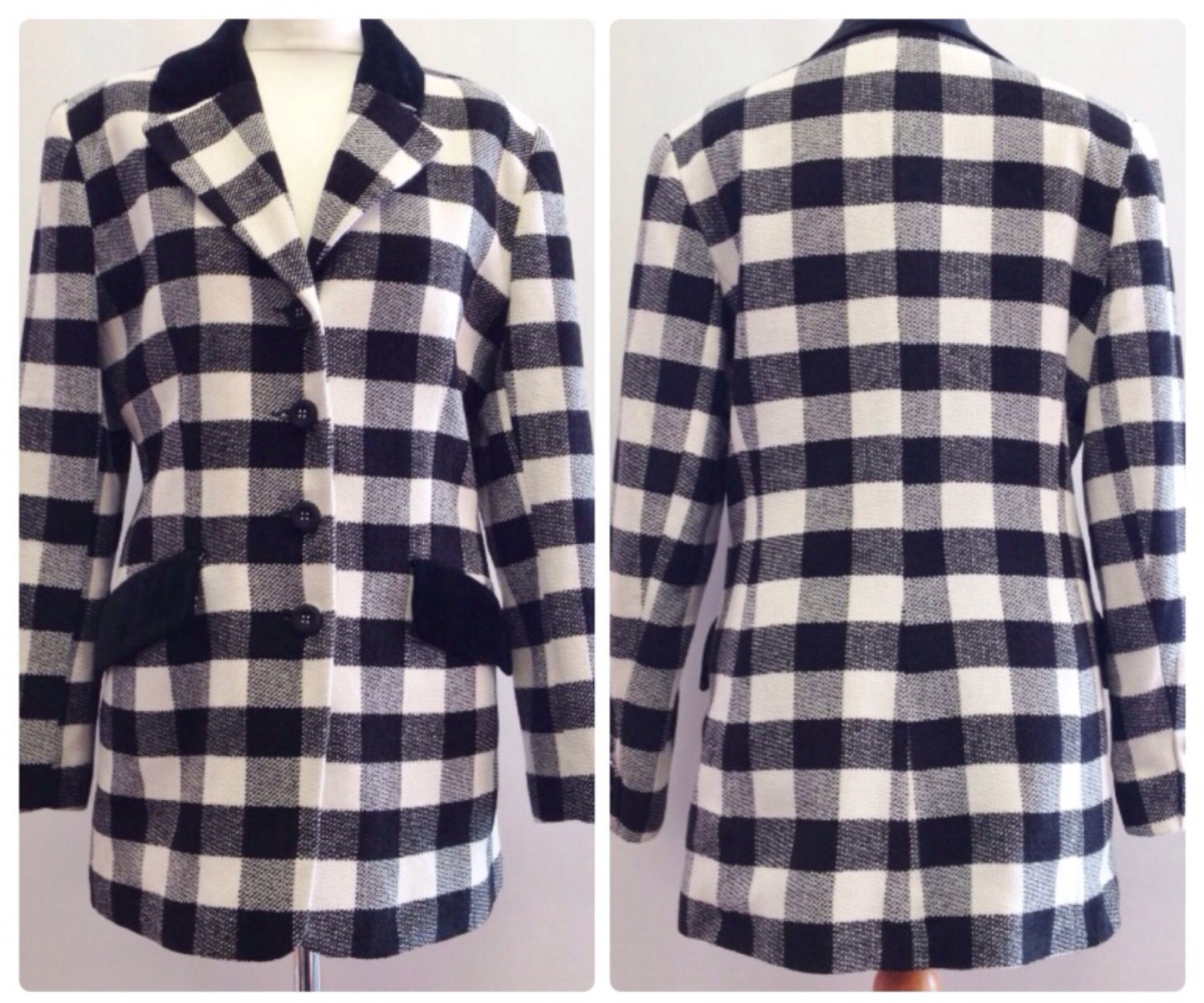 Vintage Velvet Collar Monochrome Check Blazer Coat